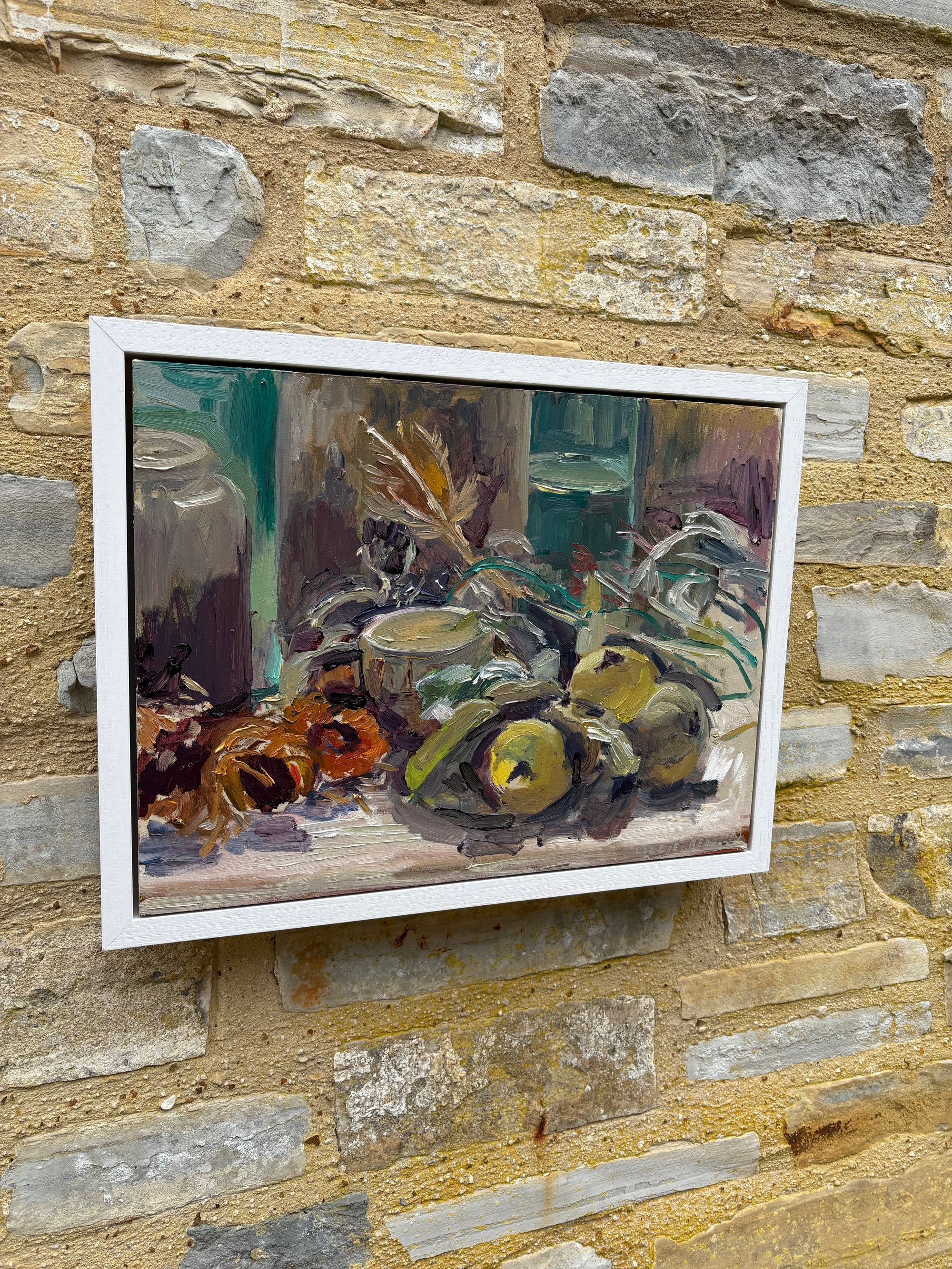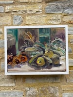 Teasel, Quinces and dried Sunflowers, bottles and vases. Oil on panel. 40cm x 30cm