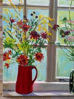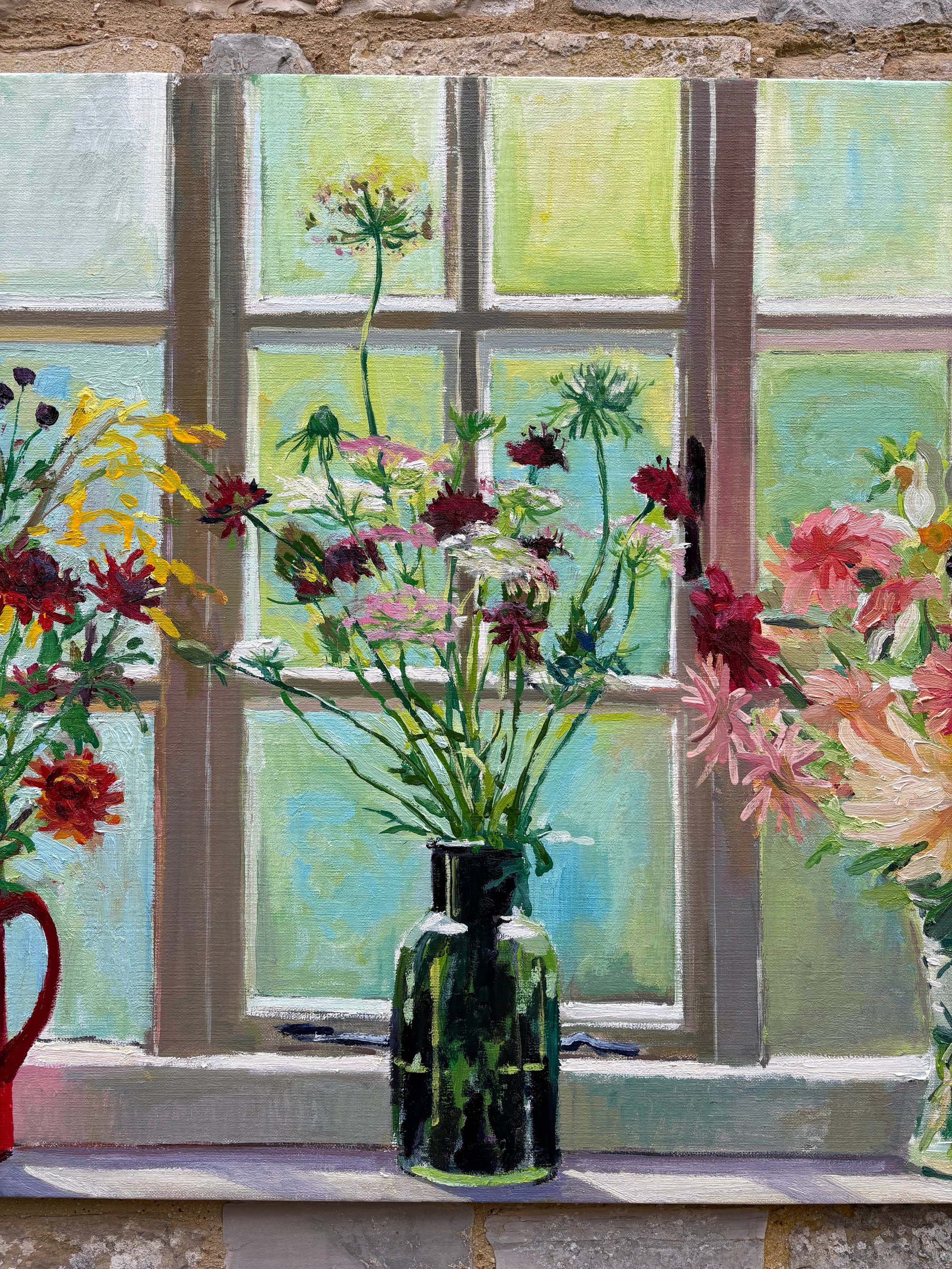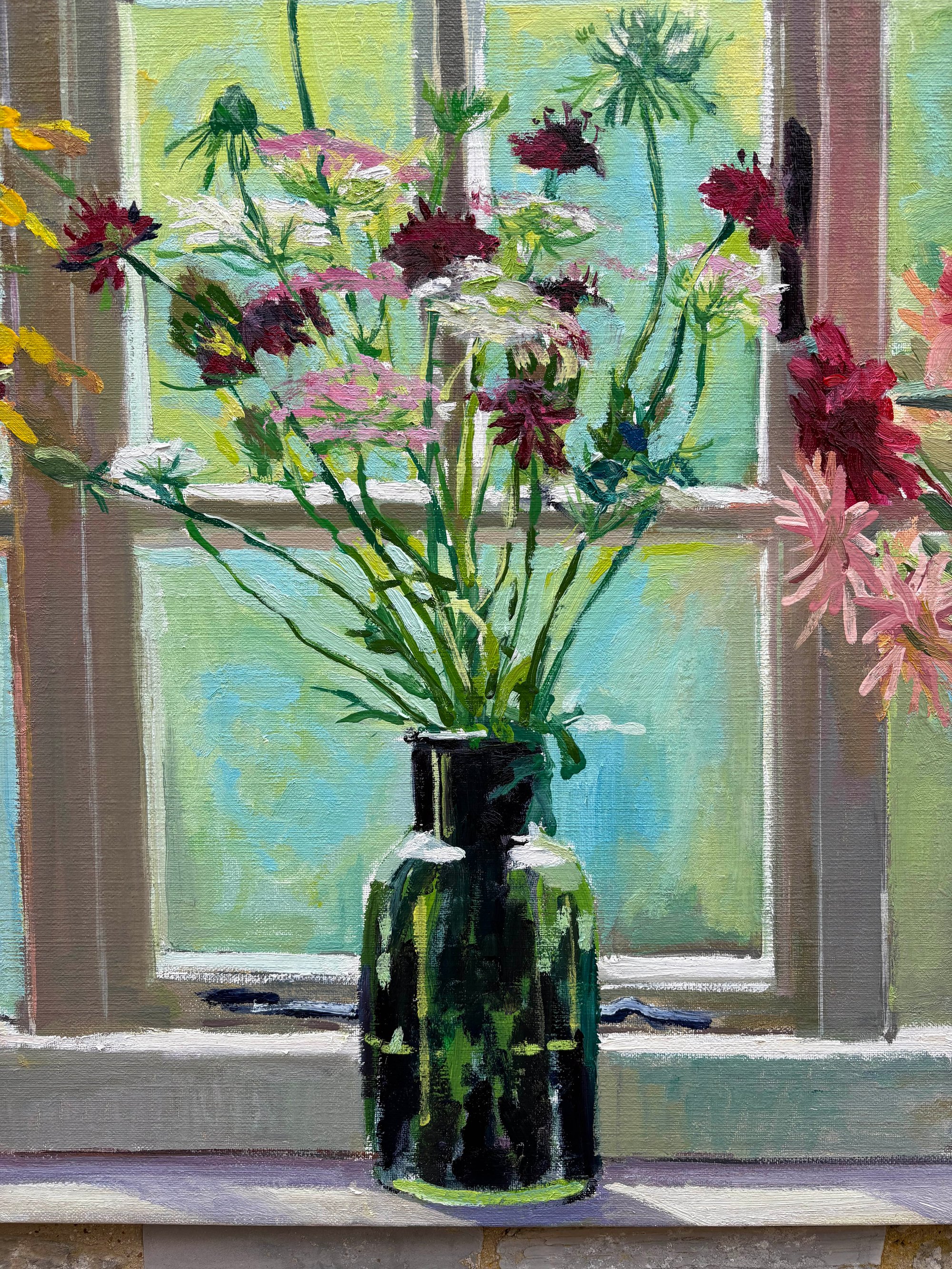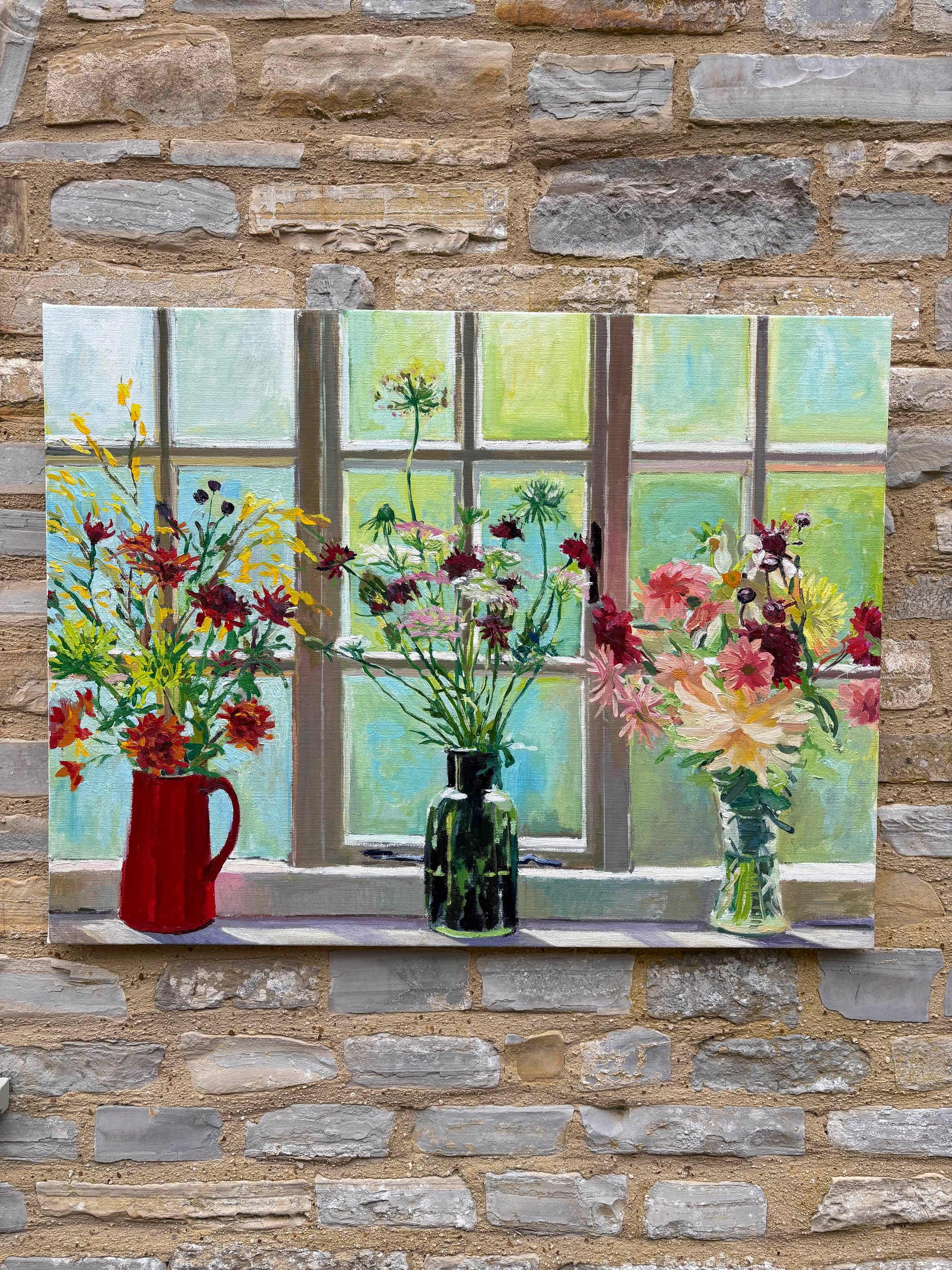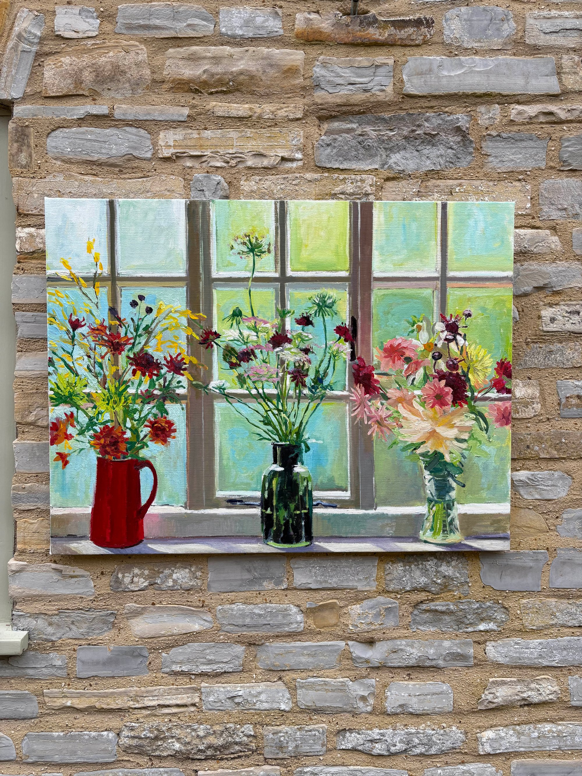Studio Window with October Flowers. Oil on linen canvas. 100cm x 76cm currently drying, to be framed
